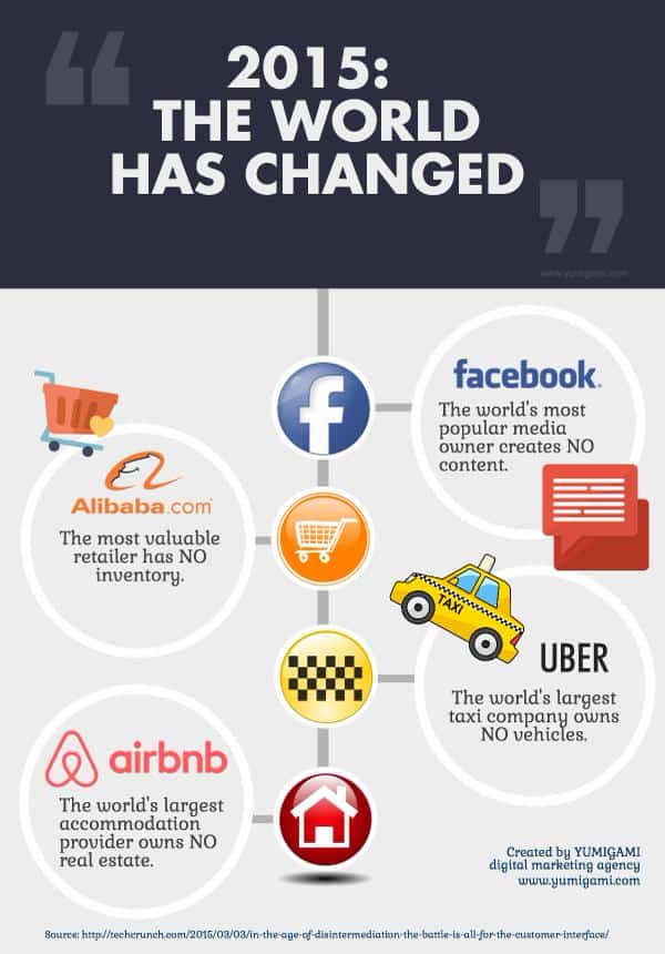 It was great to point out the fact that those industry leaders in the sharing economy (Facebook, AirBnB, Uber etc) do not own or offer any of the products or services that their business hosts. I had never thought about it this way!